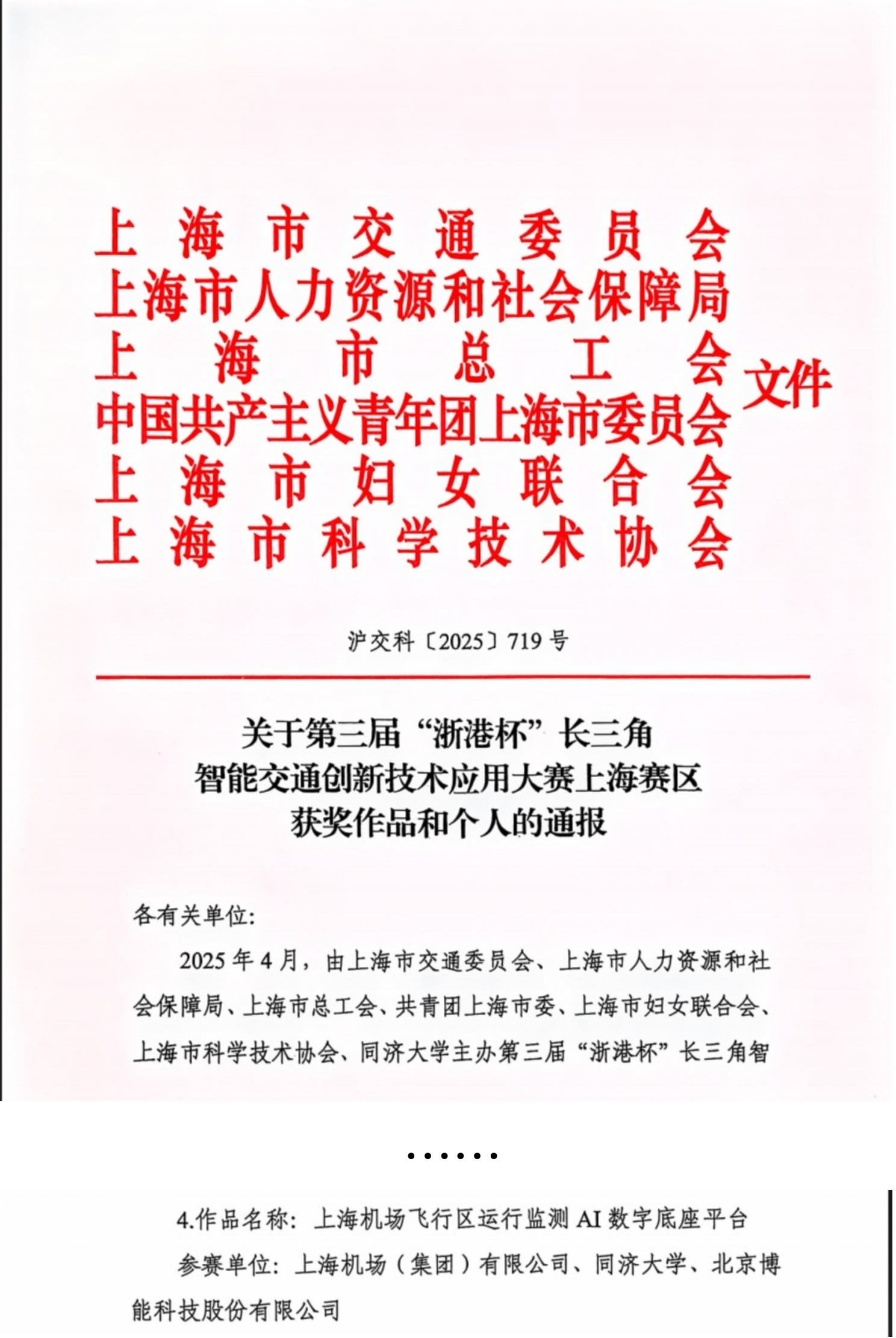 2016年1月5日,由长三角三省一市联合主办的第三届“浙港杯”长三角智能交通创新技术应用大赛上海赛区评选结果正式揭晓。由北京博能科技股份有限公司(以下简称“博能股份”)联合上海机场(集团)有限公司、同济大学完成的「上海机场飞行区运行监测AI数字底座平台」项目,凭借突出的技术创新能力和成熟的应用成效,在众多参赛项目中脱颖而出,荣获上海赛区优秀奖。